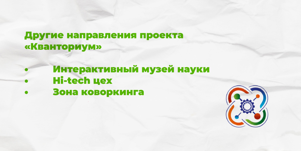 Кроме учебных помещений, в кванториумах также обычно есть: